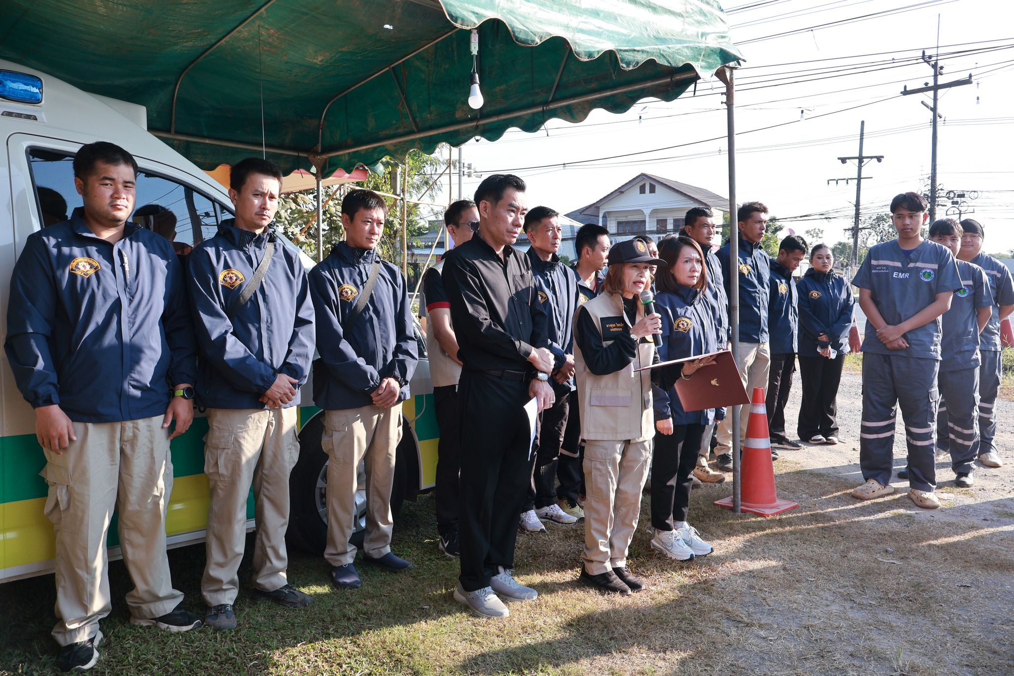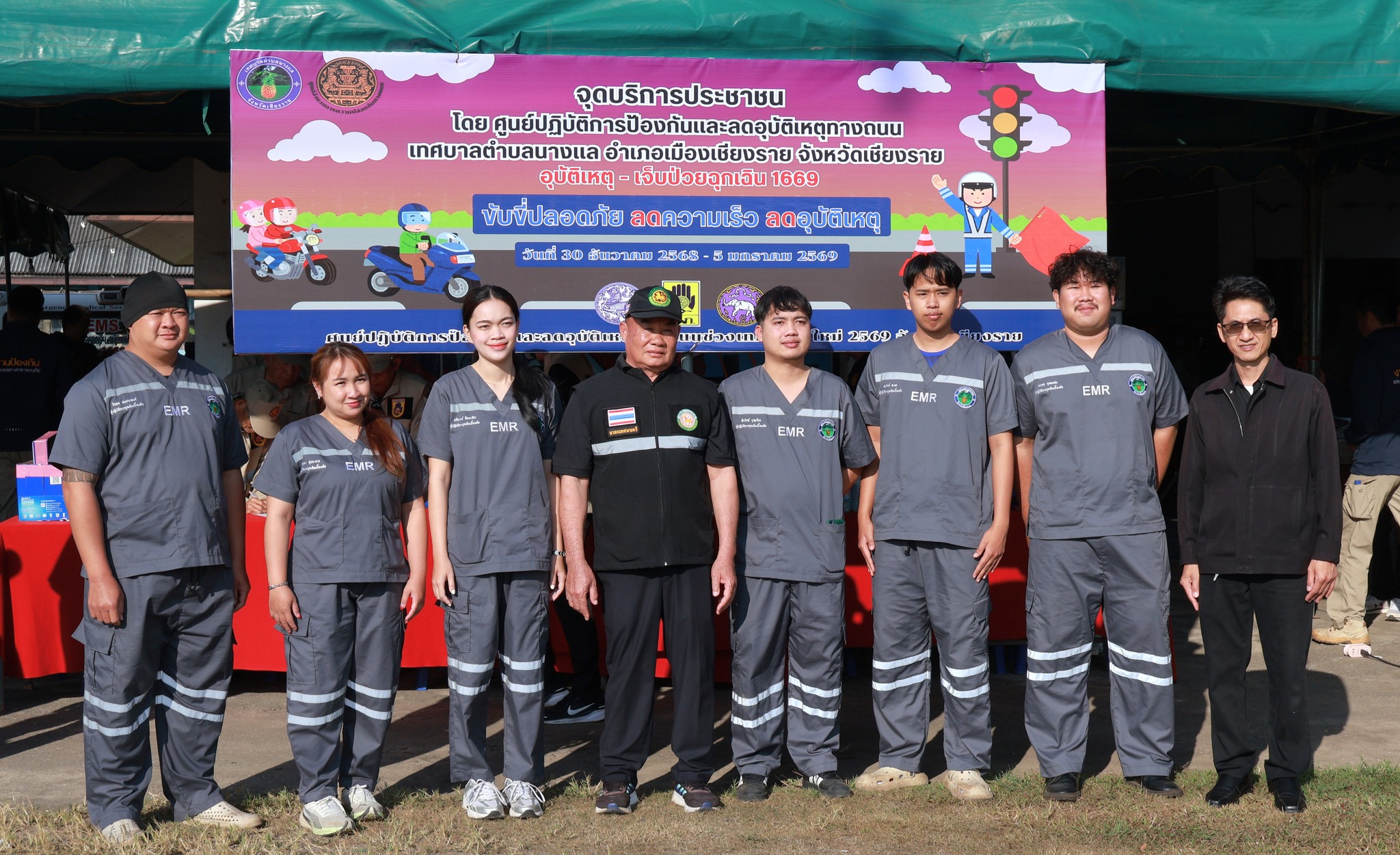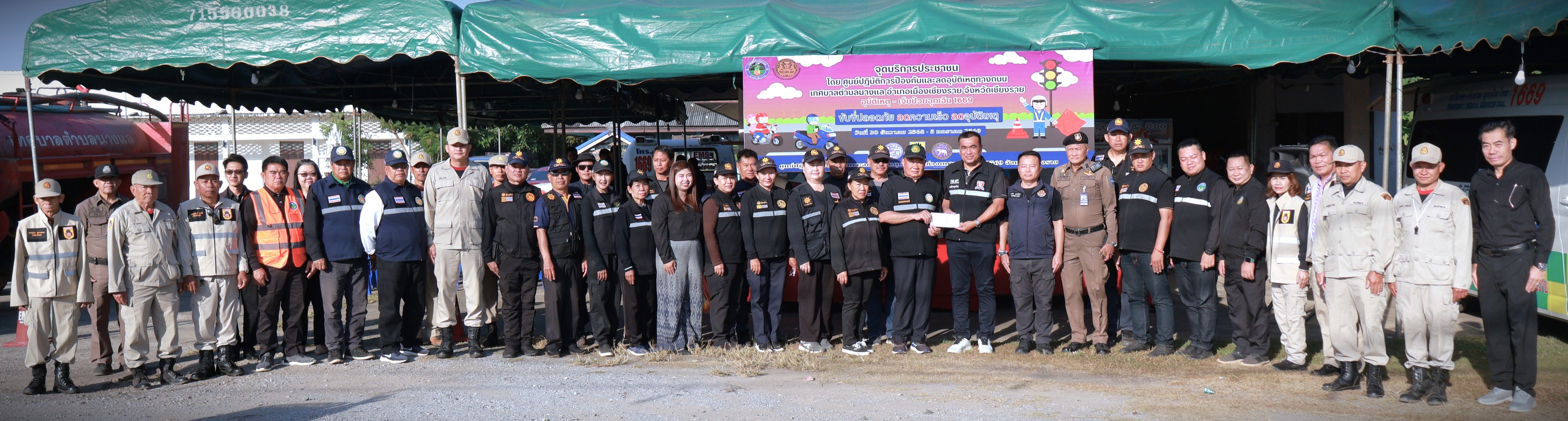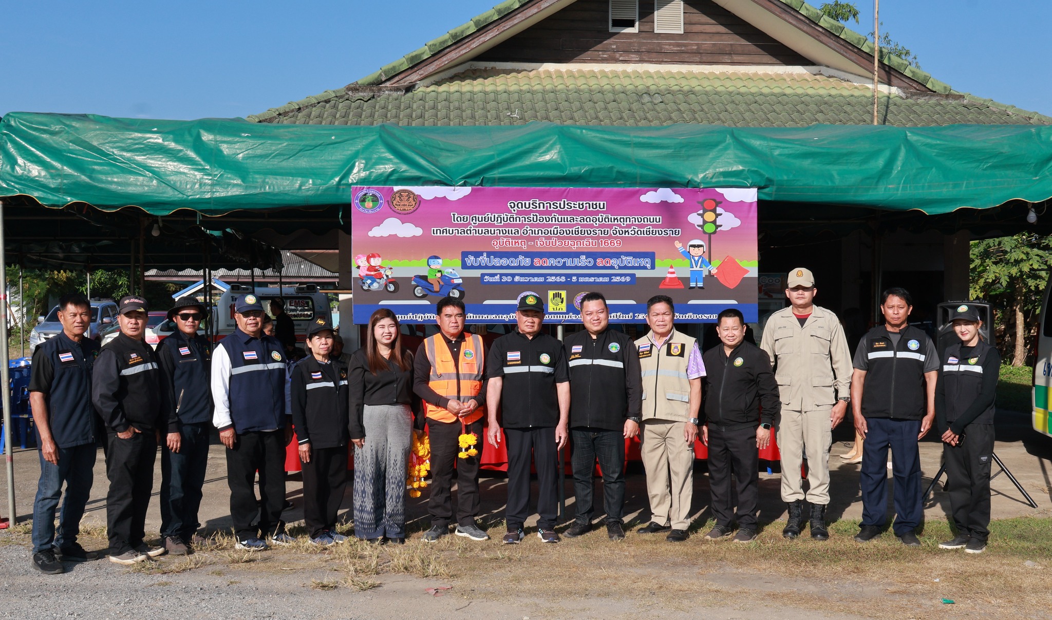 รองศาสตราจารย์ ดร.นาวิน พรมใจสา รองอธิการบดี มหาวิทยาลัยราชภัฏเชียงราย , อาสาสมัครป้องกันภัยฝ่ายพลเรือน , และเจ้าหน้าที่งานป้องกันและบรรเทาสาธารณภัยเทศบาลตำบลนางแล ร่วมการเปิดศูนย์ปฏิบัติการความปลอดภัยทางถนน