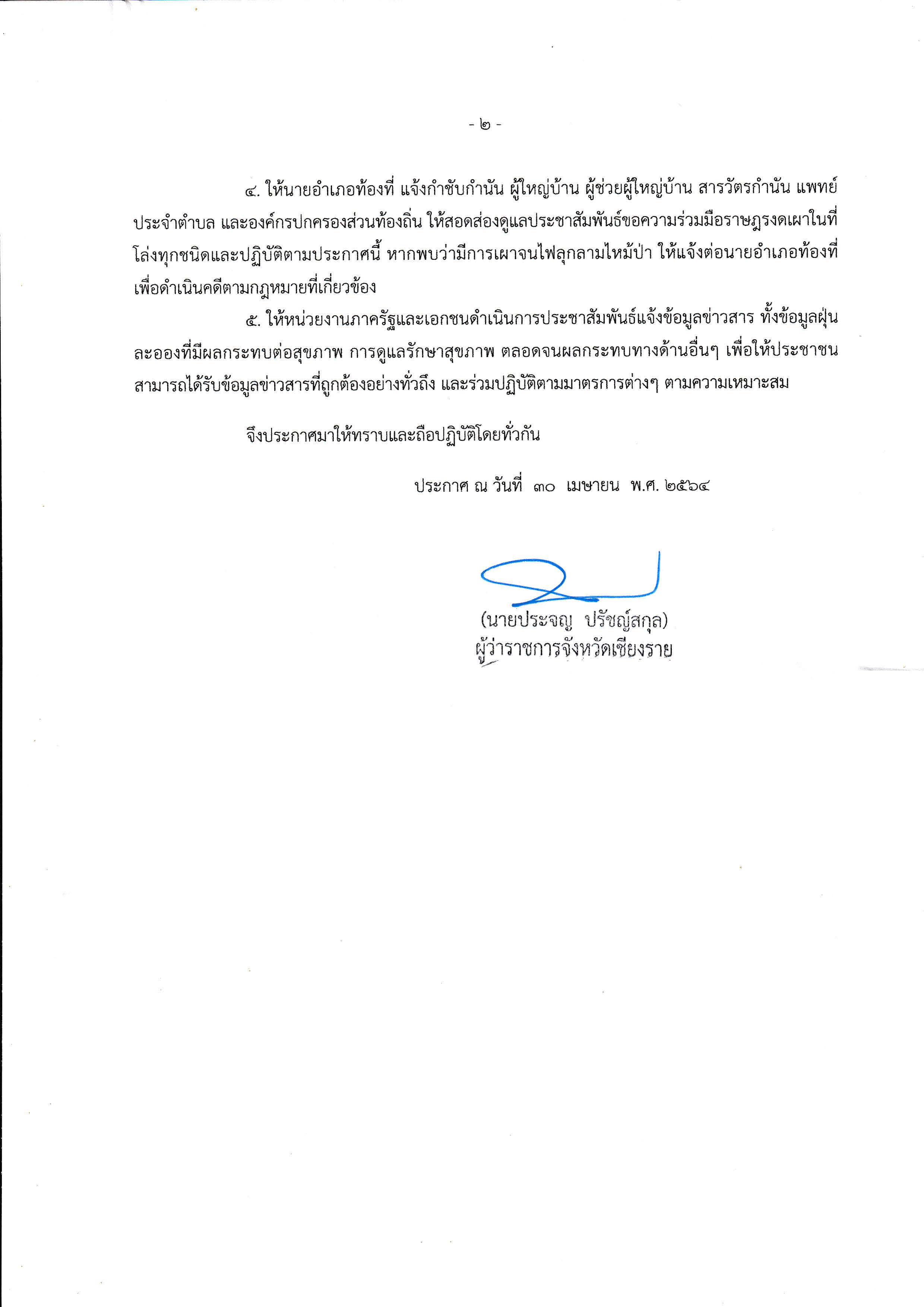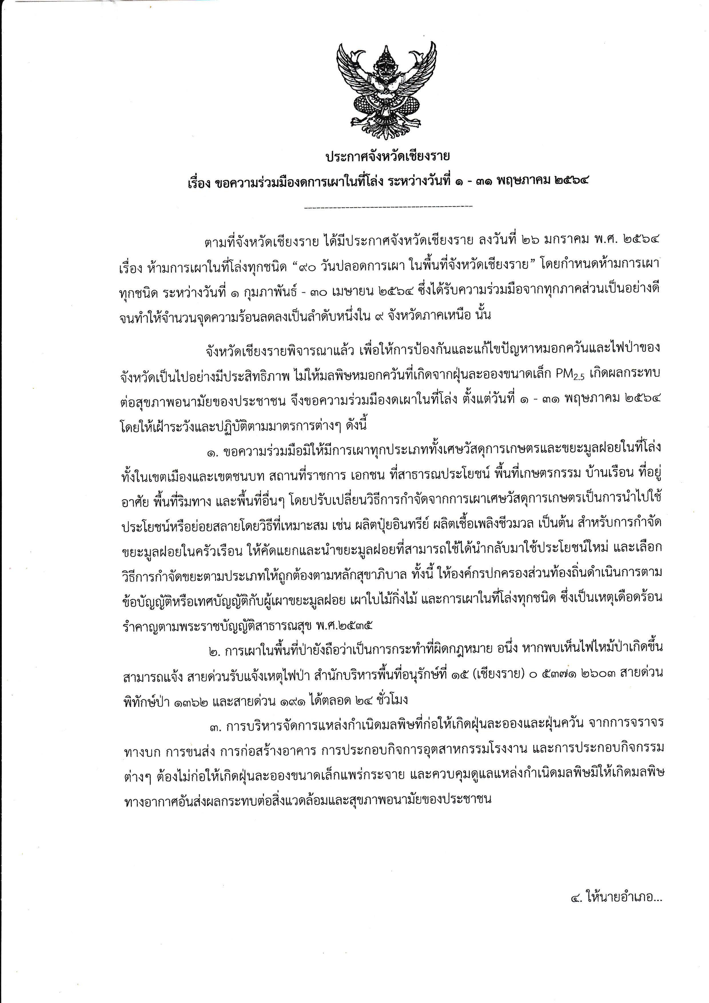 ประชาสัมพันธ์ ประกาศจังหวัดเชียงราย เรื่อง ขอความร่วมมืองดการเผาในที่โล่ง ระหว่างวันที่ 1 - 31 พฤษภาคม 2564