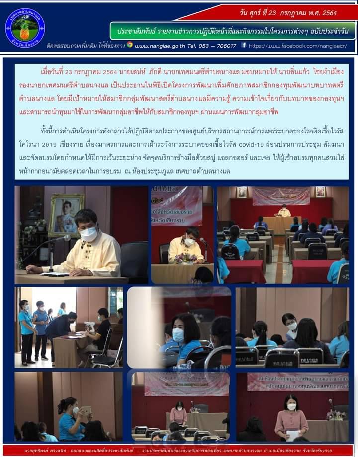 เมื่อวันที่ 23 กรกฎาคม 2564 นายเสน่ห์ ภักดี นายกเทศมนตรีตำบลนางแล มอบหมายให้ นายอิ่นแก้ว ไชยงำเมือง รองนายกเทศมนตรีตำบลนางแล เป็นประธานในพิธีเปิดโครงการพัฒนาเพิ่มศักยภาพสมาชิกกองทุนพัฒนาบทบาทสตรีตำบลนางแล โดยมีเป้าหมายให้สมาชิกกลุ่มพัฒนาสตรีตำบลนางแลมีความรู้ ความเข้าใจเกี่ยวกับบทบาทของกองทุนฯ และสามารถนำทุนมาใช้ในการพัฒนากลุ่มอาชีพให้กับสมาชิกกองทุนฯ ผ่านแผนการพัฒนากลุ่มอาชีพ ทั้งนี้การดำเนินโครงการดังกล่าวได้ปฏิบัติตามประกาศของศูนย์บริหารสถานการณ์การแพร่ระบาดของโรคติดเชื้อไวรัสโคโรนา 2019 เชียงราย เรื่องมาตรการและการเฝ้าระวังการระบาดของเชื้อไวรัส covid-19 ผ่อนปรนการประชุม สัมมนา และจัดอบรมโดยกำหนดให้มีการเว้นระยะห่าง จัดจุดบริการล้างมือด้วยสบู่ แอลกอฮอร์ และเจล ให้ผู้เข้าอบรมทุกคนสวมใส่หน้ากากอนามัยตลอดเวลาในการอบรม ณ ห้องประชุมภูแล เทศบาลตำบลนางแล