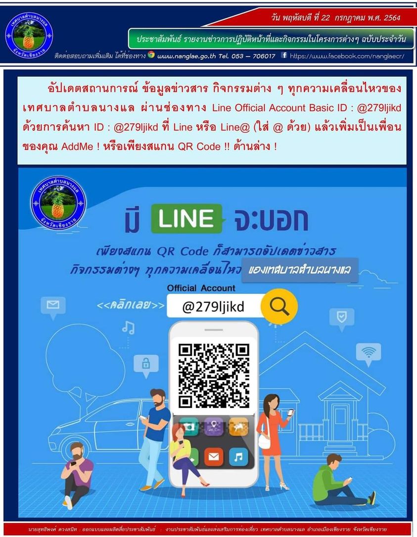 เทศบาลตำบลนางแลได้จัดทำระบบ line official account ขึ้นเพื่อรองรับระบบการประชาสัมพันธ์ให้กับผู้ใช้งานเกิน 500 คน (line กลุ่มรองรับไม่เกิน 500 คน) อัปเดตสถานการณ์ข้อมูลข่าวสารกิจกรรมต่างๆทุกความเคลื่อนไหวของเทศบาลตำบลนางแล ได้ที่ Line Official Account Basic ID : @279ljikd