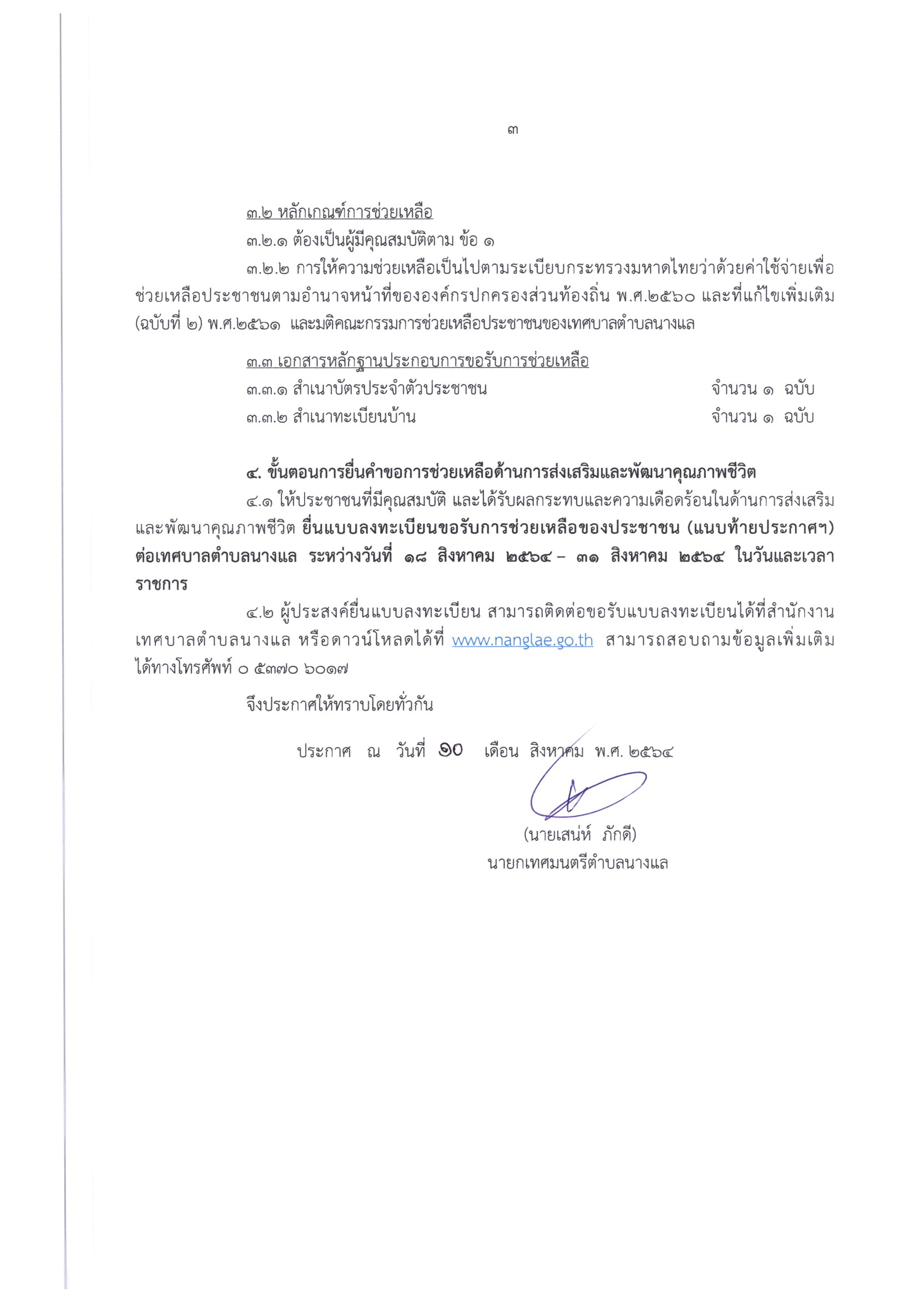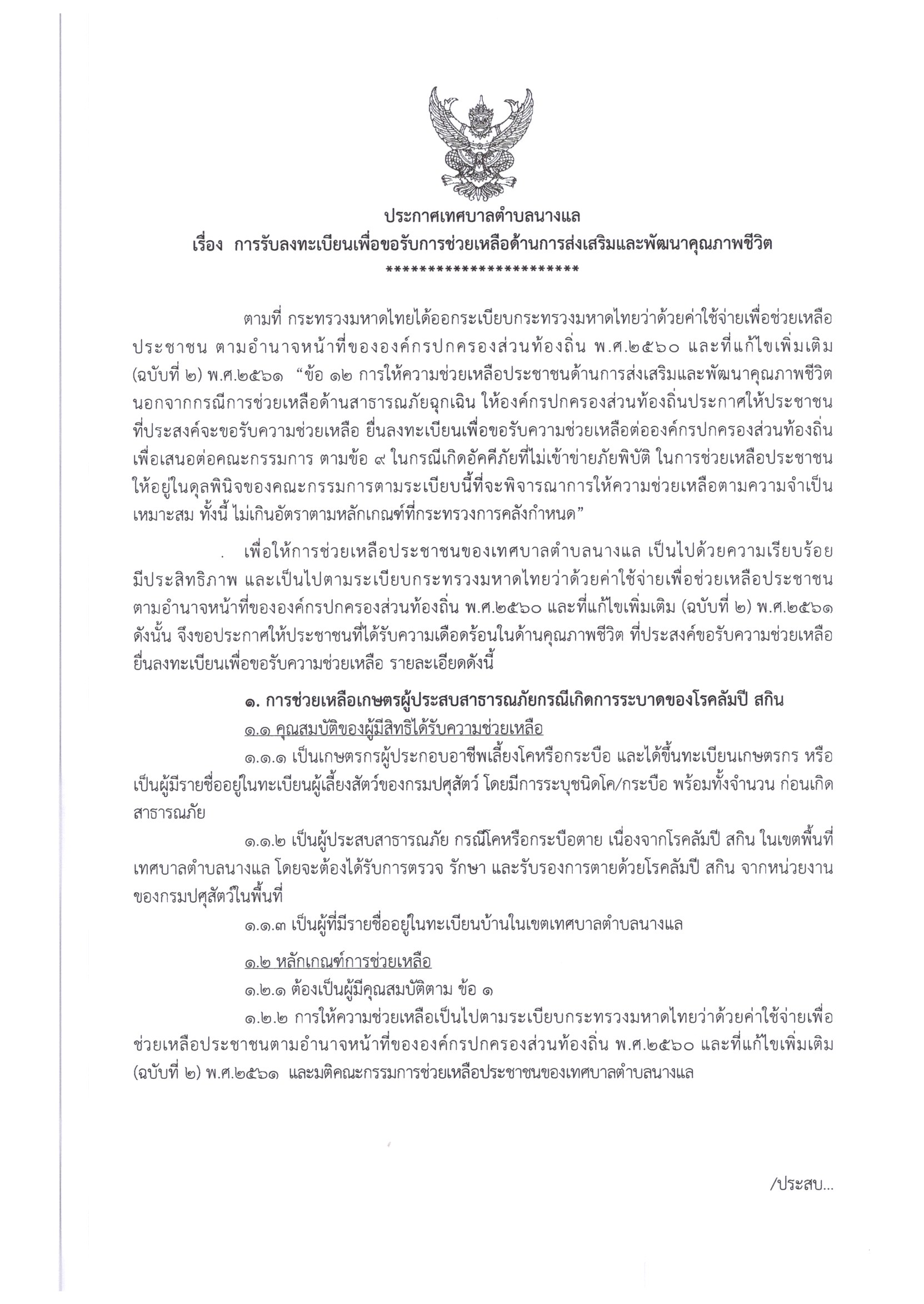 เทศบาลตำบลนางแล ประกาศการรับลงทะเบียนเพื่อขอรับการช่วยเหลือด้านการส่งเสริมและพัฒนาคุณภาพชีวิต เพื่อให้ประชาชนทีได้รับความเดือดร้อนในด้านคุณภาพชีวิต ที่ประสงค์ขอรับความช่วยเหลือยื่นลงทะเบียนเพื่อขอรับความช่วยเหลือ ดังนี้