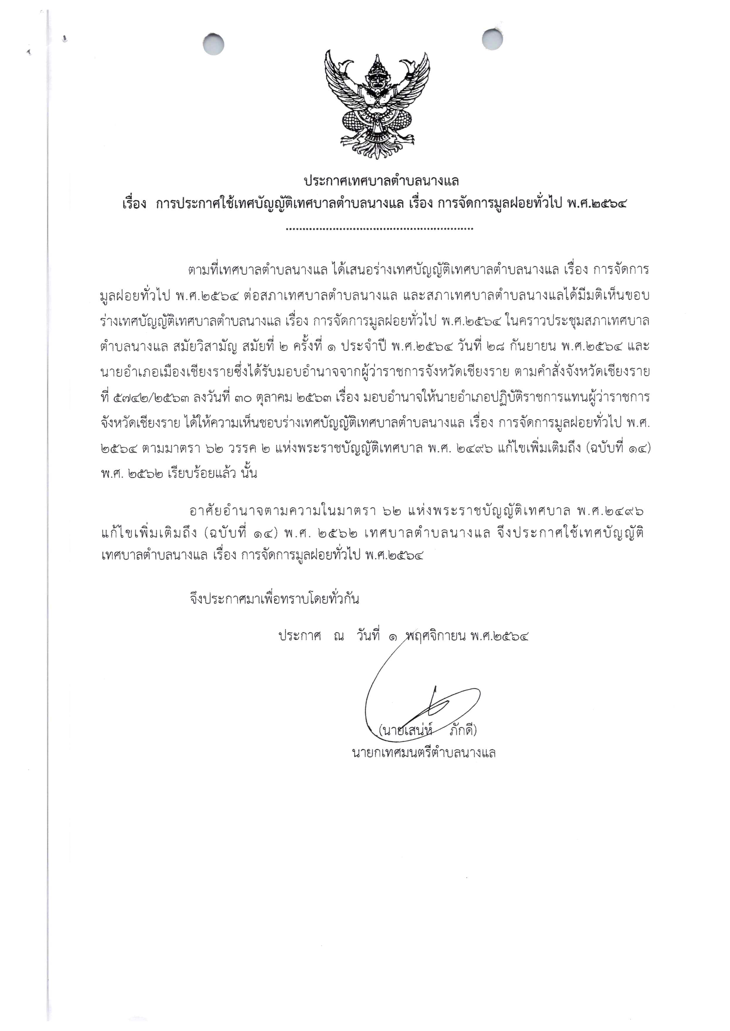 ประกาศเทศ การใช้เทศบัญญัติเทศบาลตำบลนางแล เรื่อง การจัดการมูลฝอยทั่วไป พ.ศ.2564