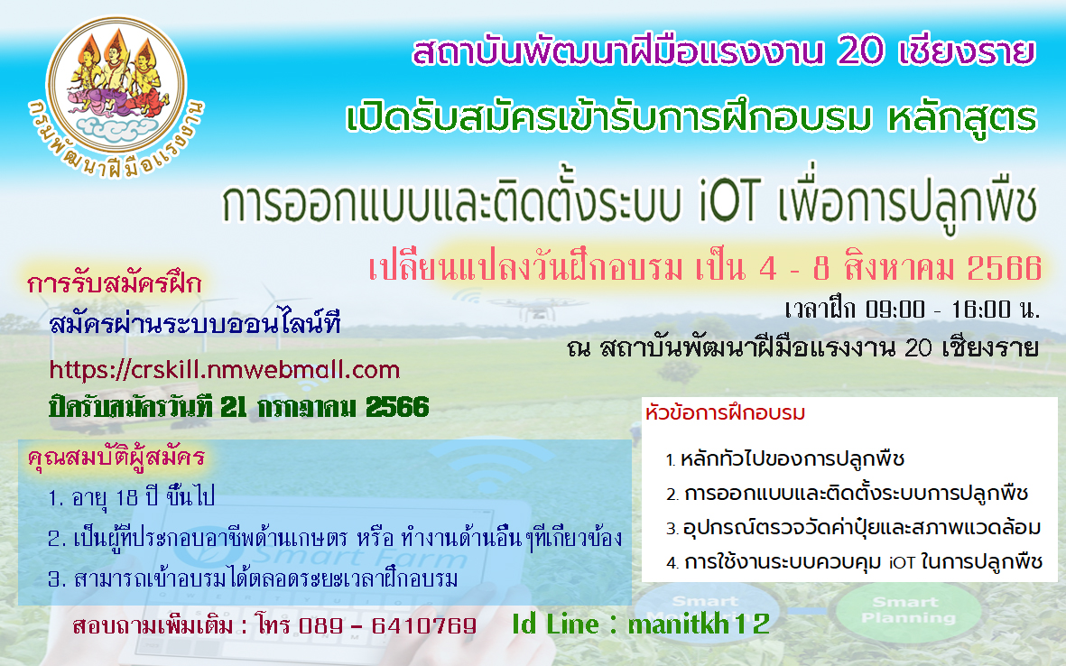 เทศบาลตำบลนางแล ร่วมกับสถาบันพัฒนาฝีมือแรงงาน 20 เชียงราย ขอเชิญชวนสมัครฝึกอบรมหลักสูตร การออกแบบและติดตั้งระบบ iot เพื่อการปลูกพืช สามารถดูรายละเอียดและสมัครออนไลน์ได้ที่ https://crskill.nmwebmall.com