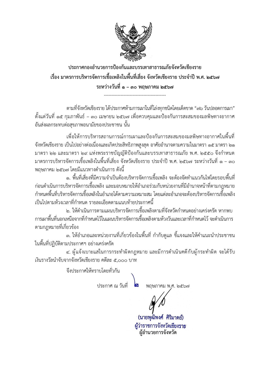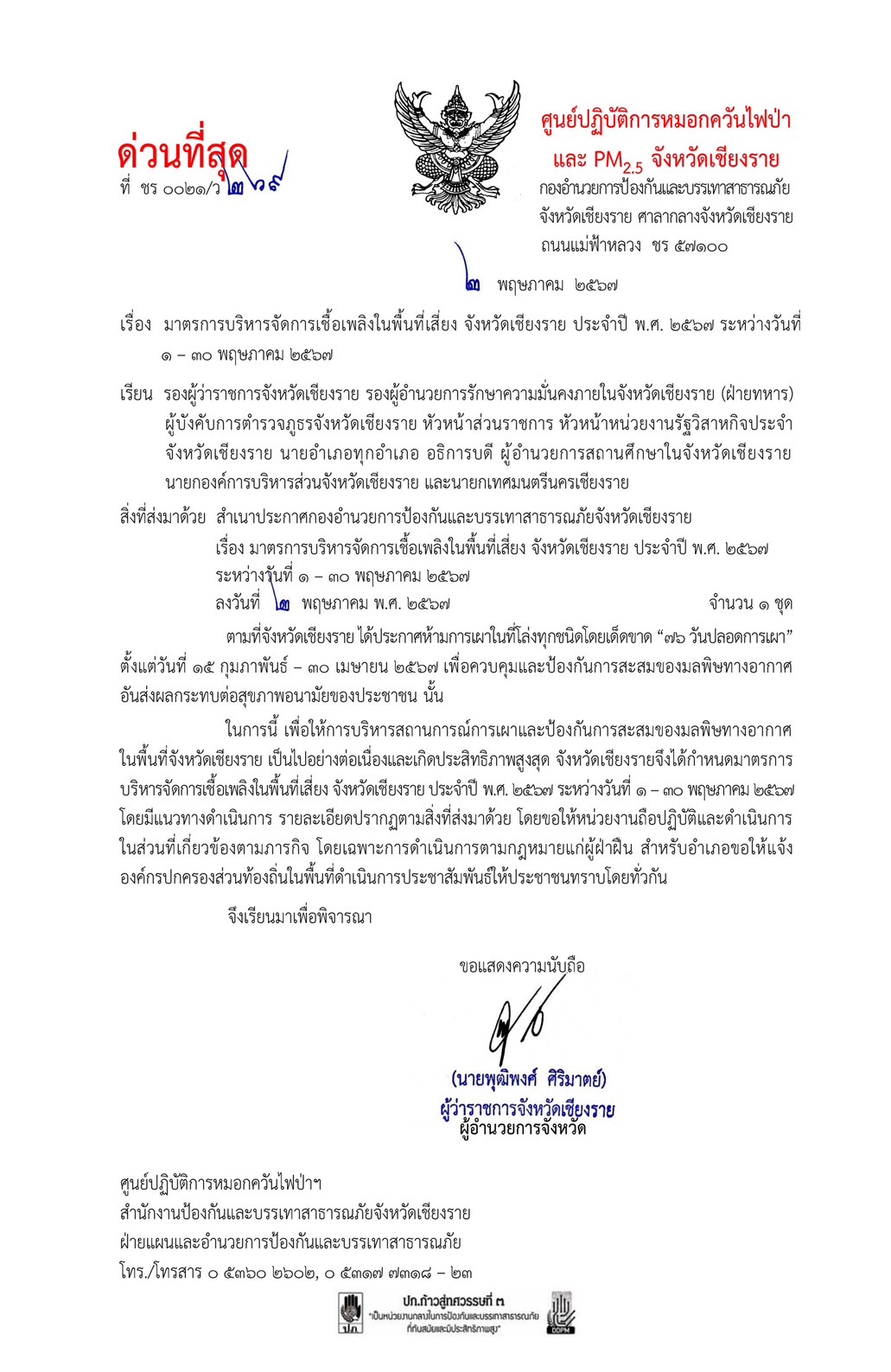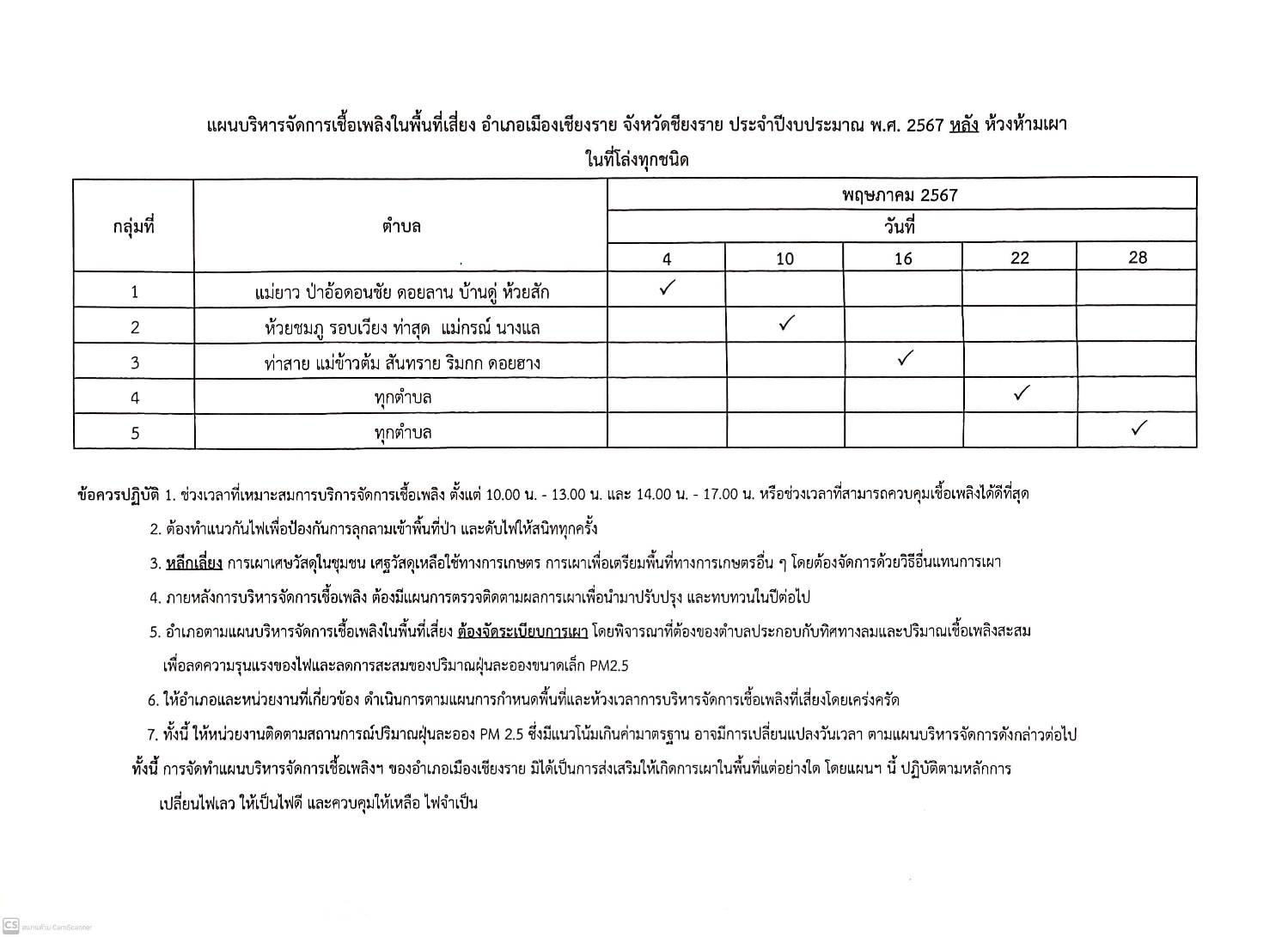 มาตรการบริหารจัดการเชื้อเพลิงในพื้นที่เสี่ยง จังหวัดเชียงราย ประจำปี พ.ศ.2567 ระหว่างวันที่ 1-30 พฤษภาคม 2567