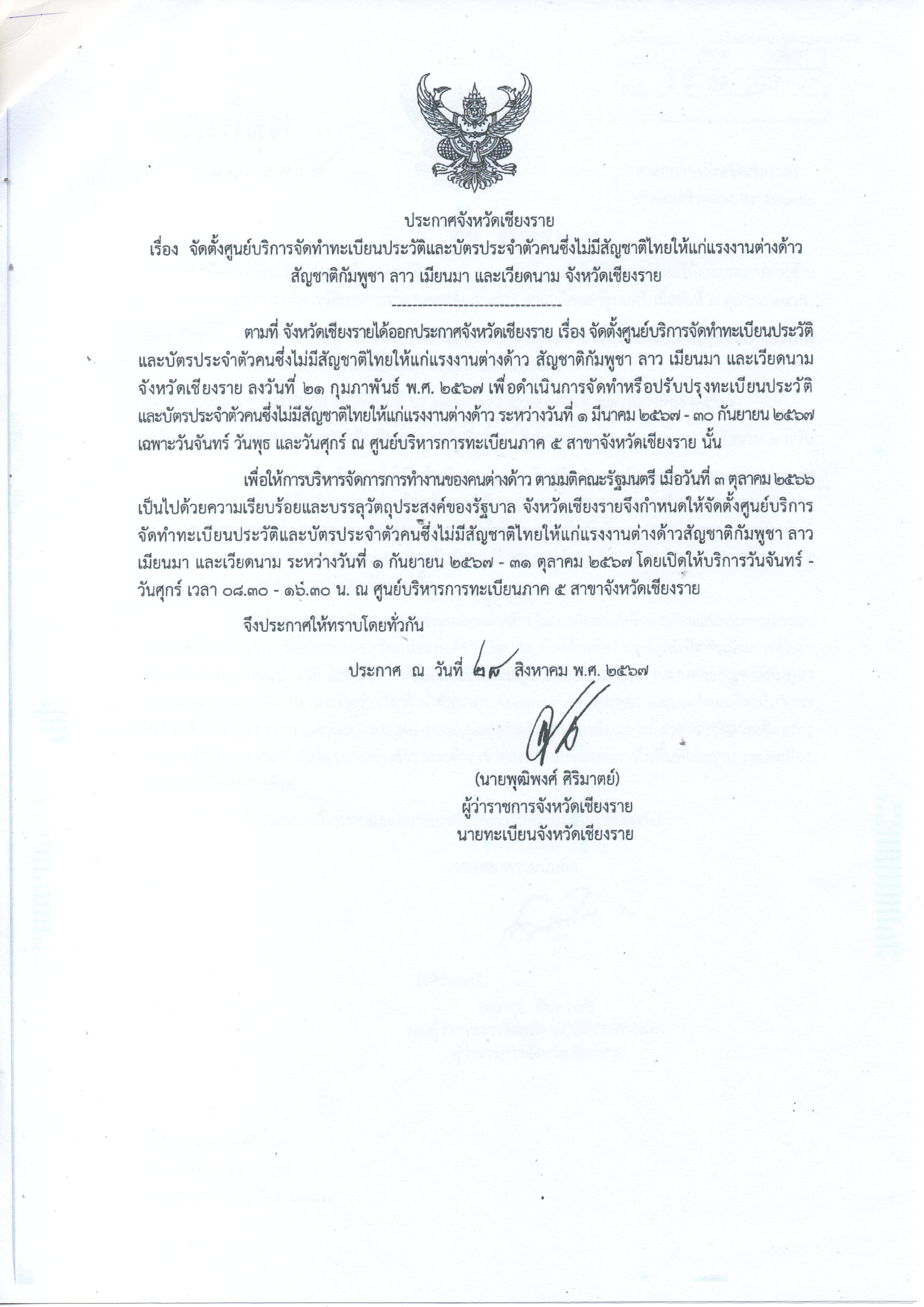ประชาสัมพันธ์ศูนย์บริการจัดทำทะเบียนประวัติและบัตรประจำตัวคนซึ่งไม่มีสัญชาติไทย ให้แก่แรงงานต่างด้าวสัญชาติกัมพูชา ลาว เมียนมา และเวียดนาม จังหวัดเชียงราย