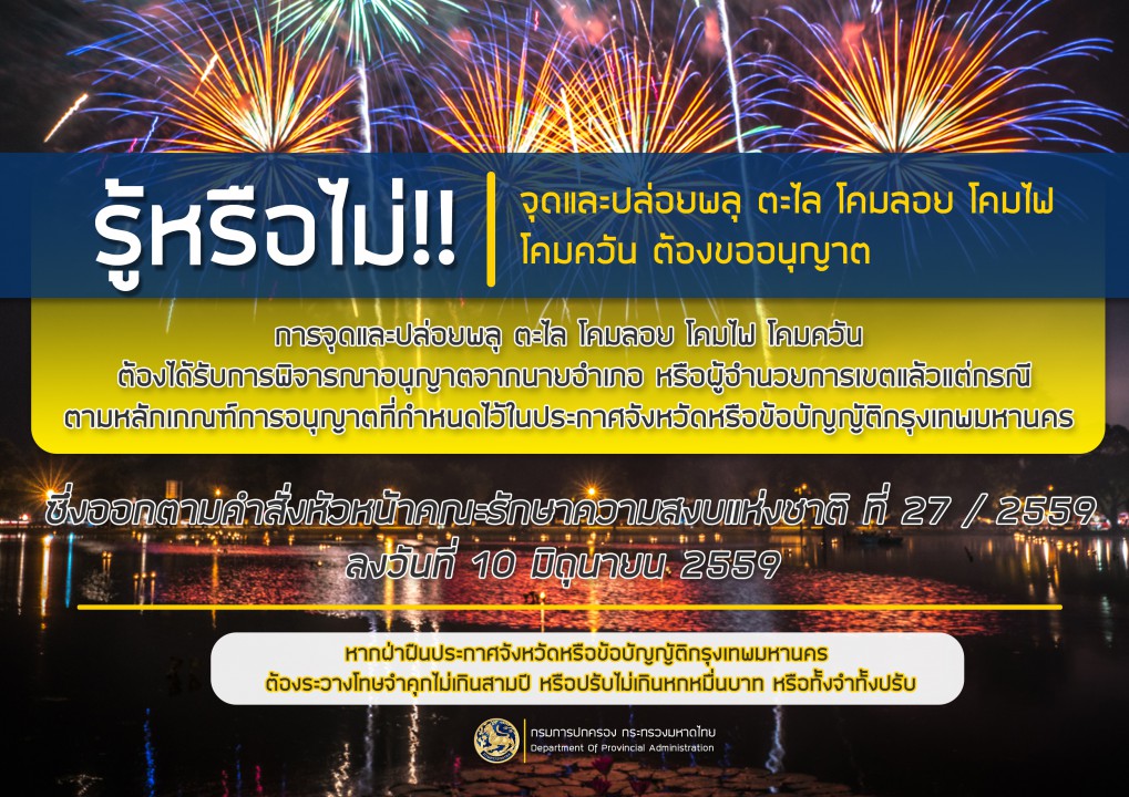 การกวดขันการเล่นดอกไม้เพลิง การจุดและปล่อยพลุ ตะไล โคมลอย โคมไฟ โคมควัน และมาตรการกำกับดูแลสถานบริการ สถานประกอบการและสถานที่ประกอบธุรกิจโรงแรม ในช่วงเทศการ