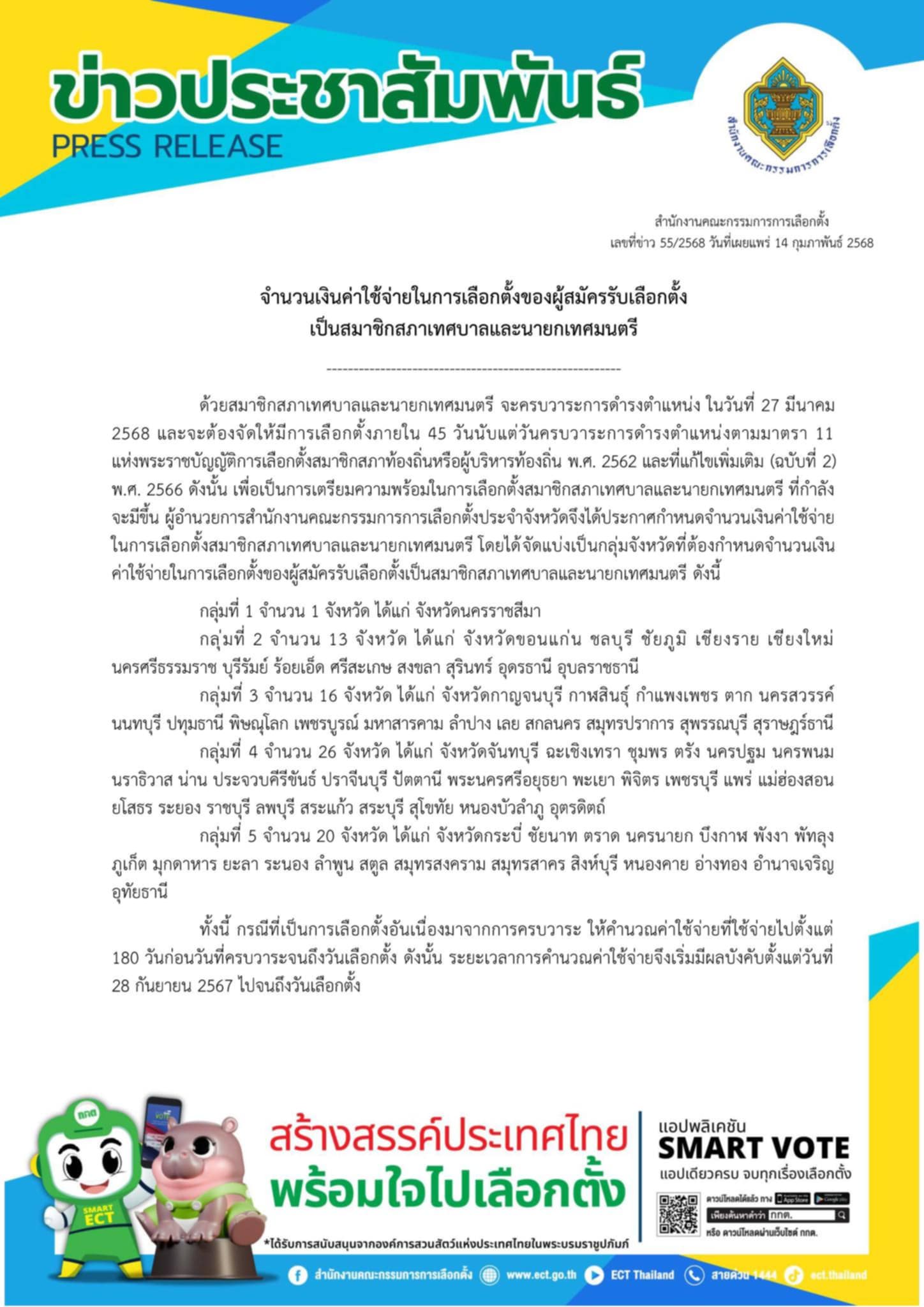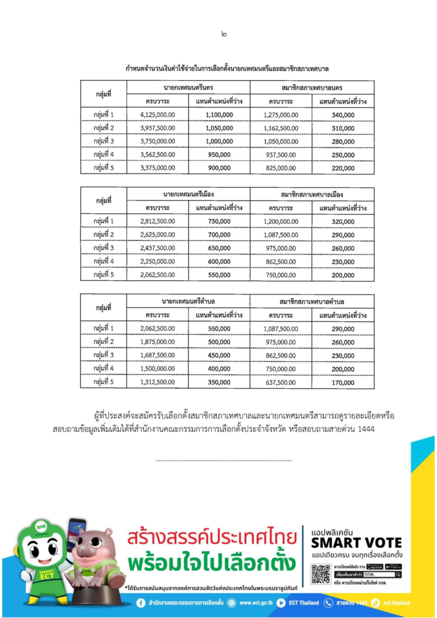 จำนวนเงินค่าใช้จ่ายในการเลือกตั้งของผู้สมัครรับเลือกตั้ง สท. และนายกเทศมนตรี เชียงรายกลุ่มที่ 2 (กรณีครบวาระ) เทศบาลนคร นายก 3,937,500 บาท สมาชิก 1,162,500 บาท เทศบาลตำบล นายก 1,875,000 บาท สมาชิก 975,000 บาท