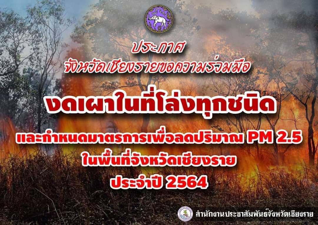 ประกาศจังหวัดเชียงราย เรื่องขอความร่วมมืองดเผาในที่โล่งทุกชนิด และกำหนดมาตรการเพื่อลดปริมาณฝุ่นละอองขนาดเล็ก PM2.5 ในพื้นที่จังหวัดเชียงราย