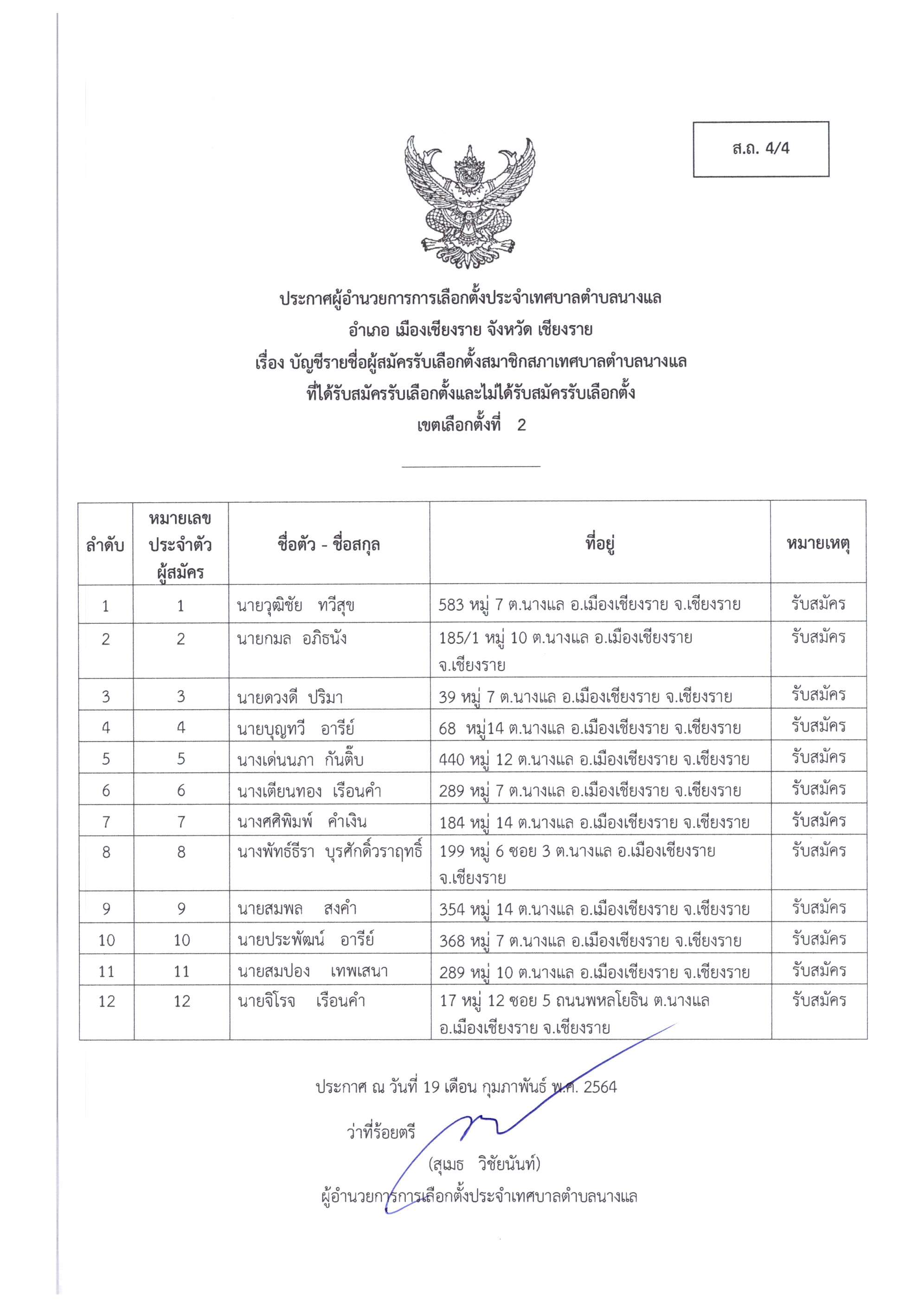 ประชาสัมพันธ์ ประกาศบัญชีรายชื่อผู้สมัครรับเลือกตั้งสมาชิกสภาเทศบาลตำบลนางแล ที่ได้รับสมัครรับเลือกตั้งและไม่ได้รับสมัครรับเลือกตั้ง ส.ถ. 4/4 เขตเลือกตั้งที่ 2