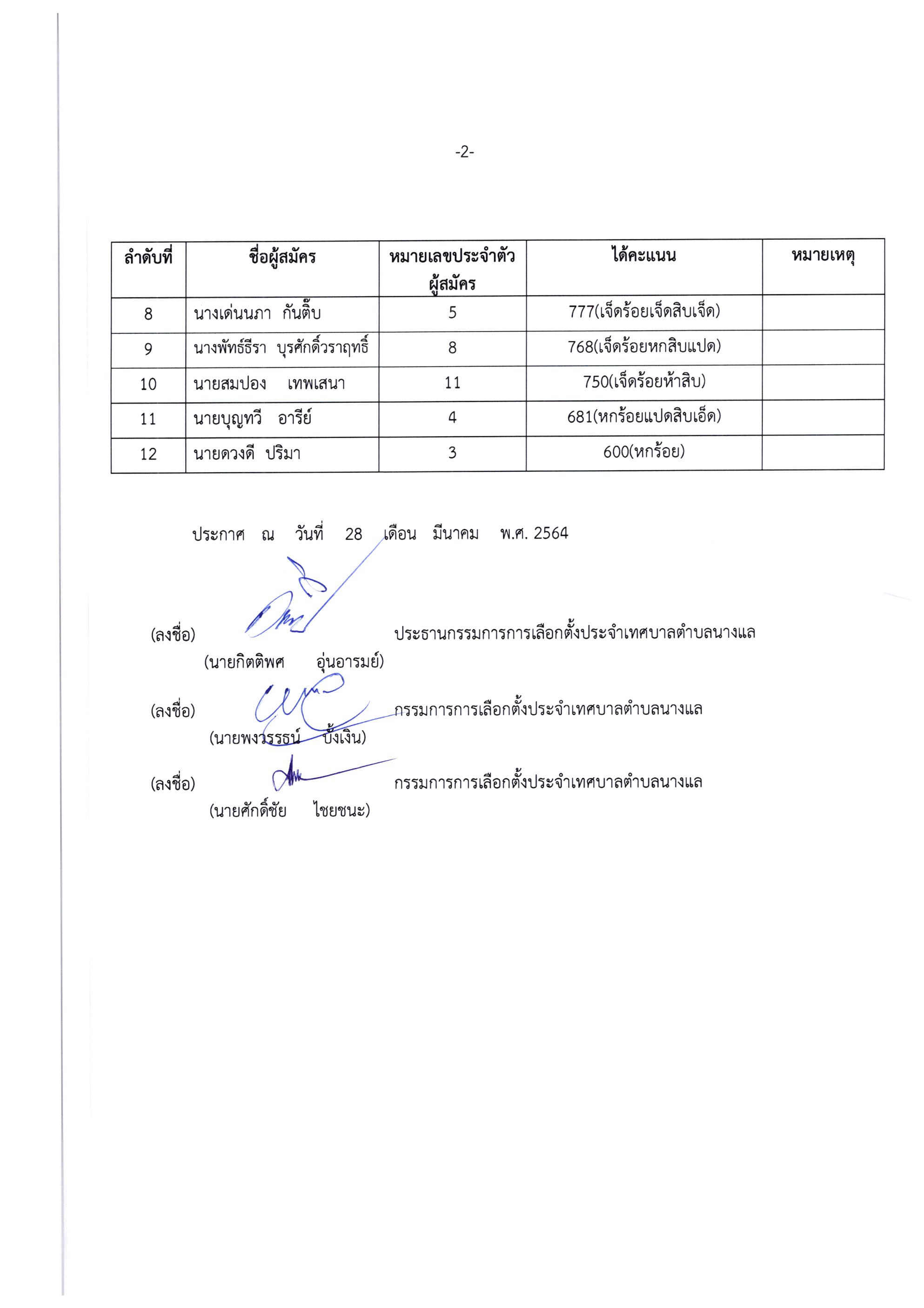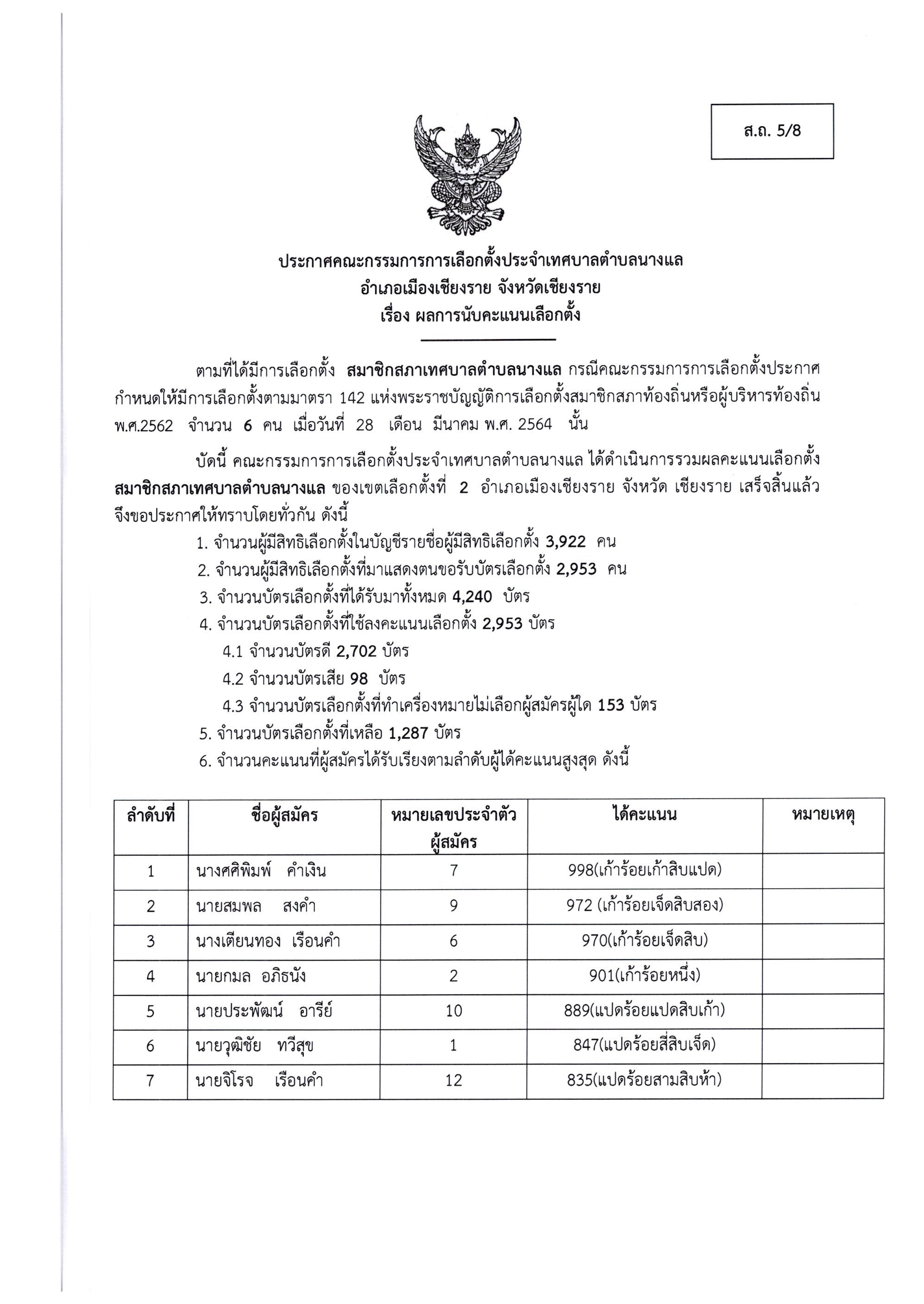 ประชาสัมพันธ์ ประกาศคณะกรรมการการเลือกตั้งประจำเทศบาลตำบลนางแล เรื่อง ผลการนับคะแนนเลือกตั้ง ส.ถ. 5/8 (เขตเลือกตั้งที่ 2)