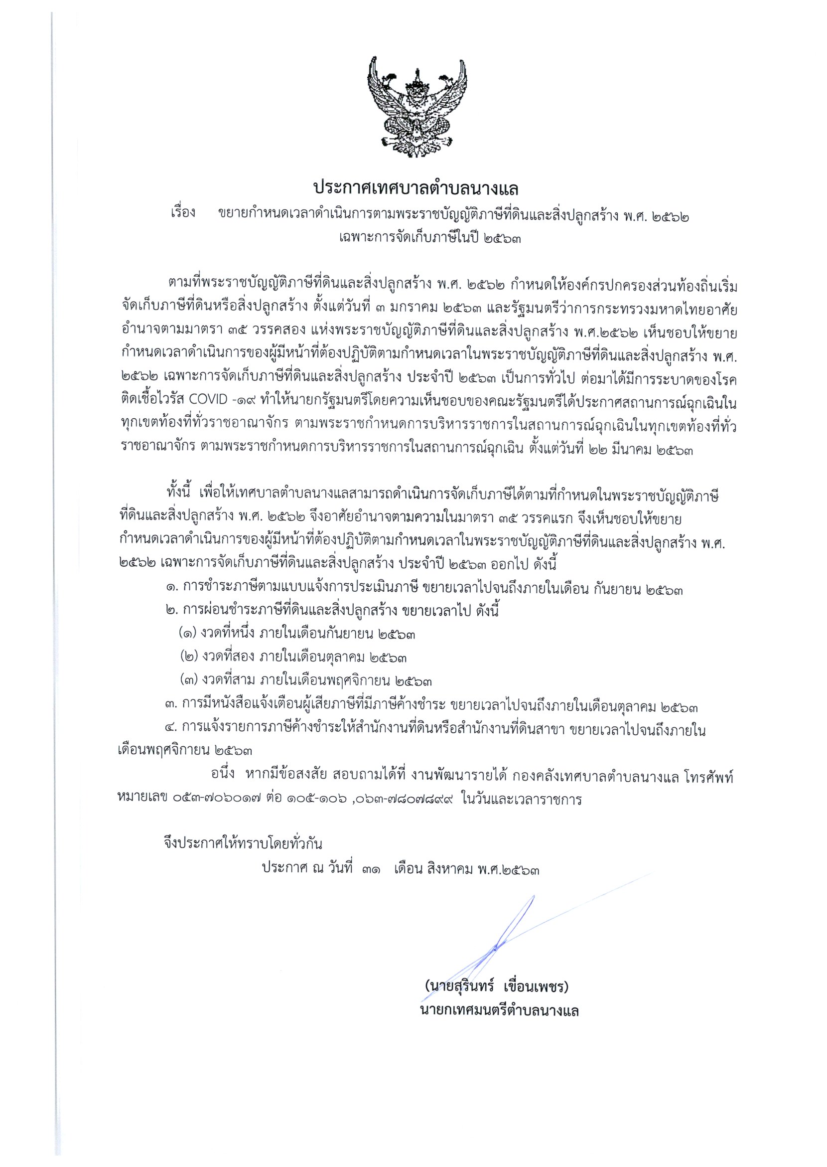 ประกาศเทศบาลตำบลนางแล เรื่องขยายเวลาดำเนินการตามพระราชบัญญัติภาษีที่ดินและสิ่งปลูกสร้าง พ.ศ. 2562 เฉพาะการจัดเก็บภาษีในปี 2563